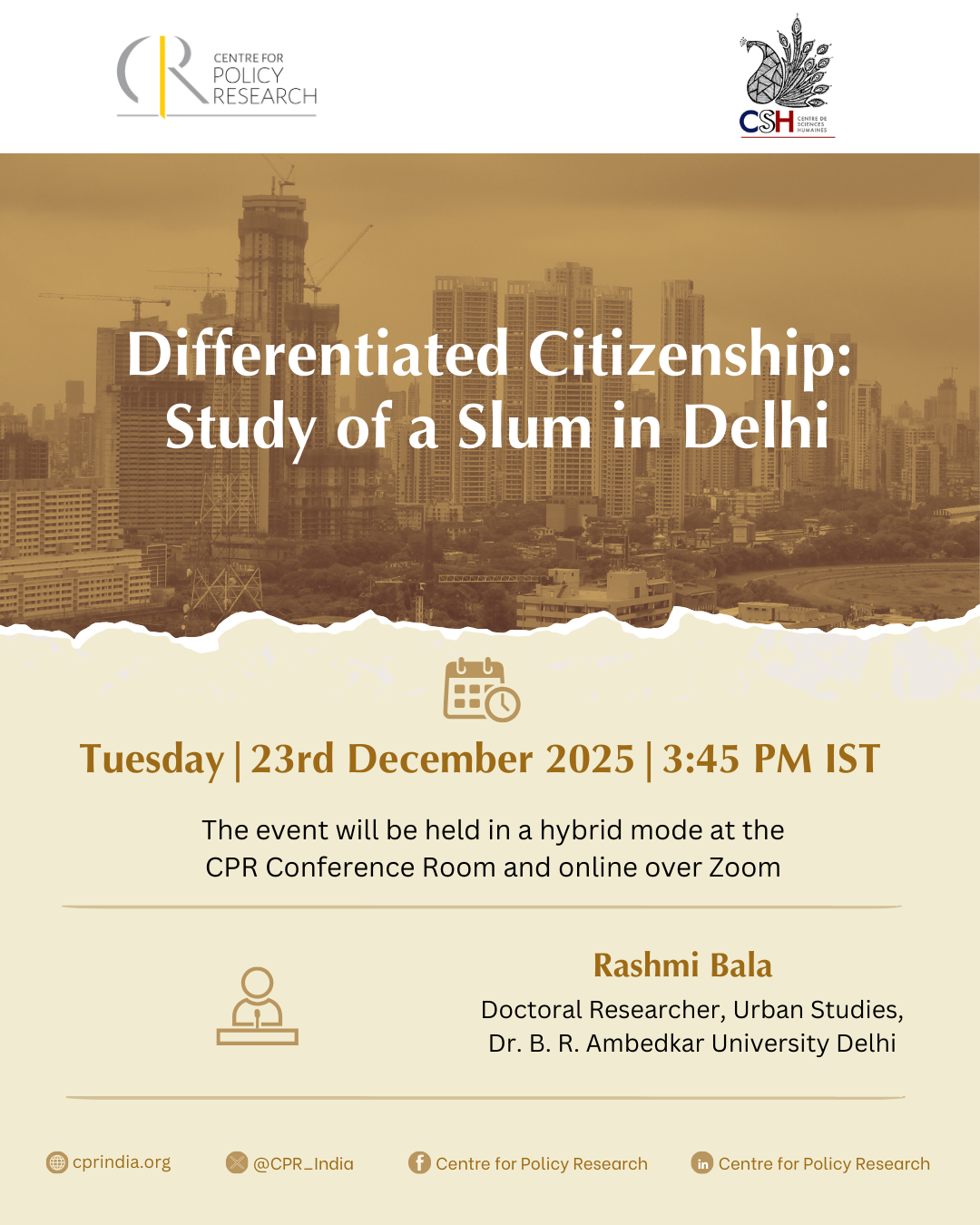 Differentiated Citizenship: Study of a Slum in Delhi Dec 23 December 23, 2025 3:45 pm to 5:15 pm ADD TO CALENDAR