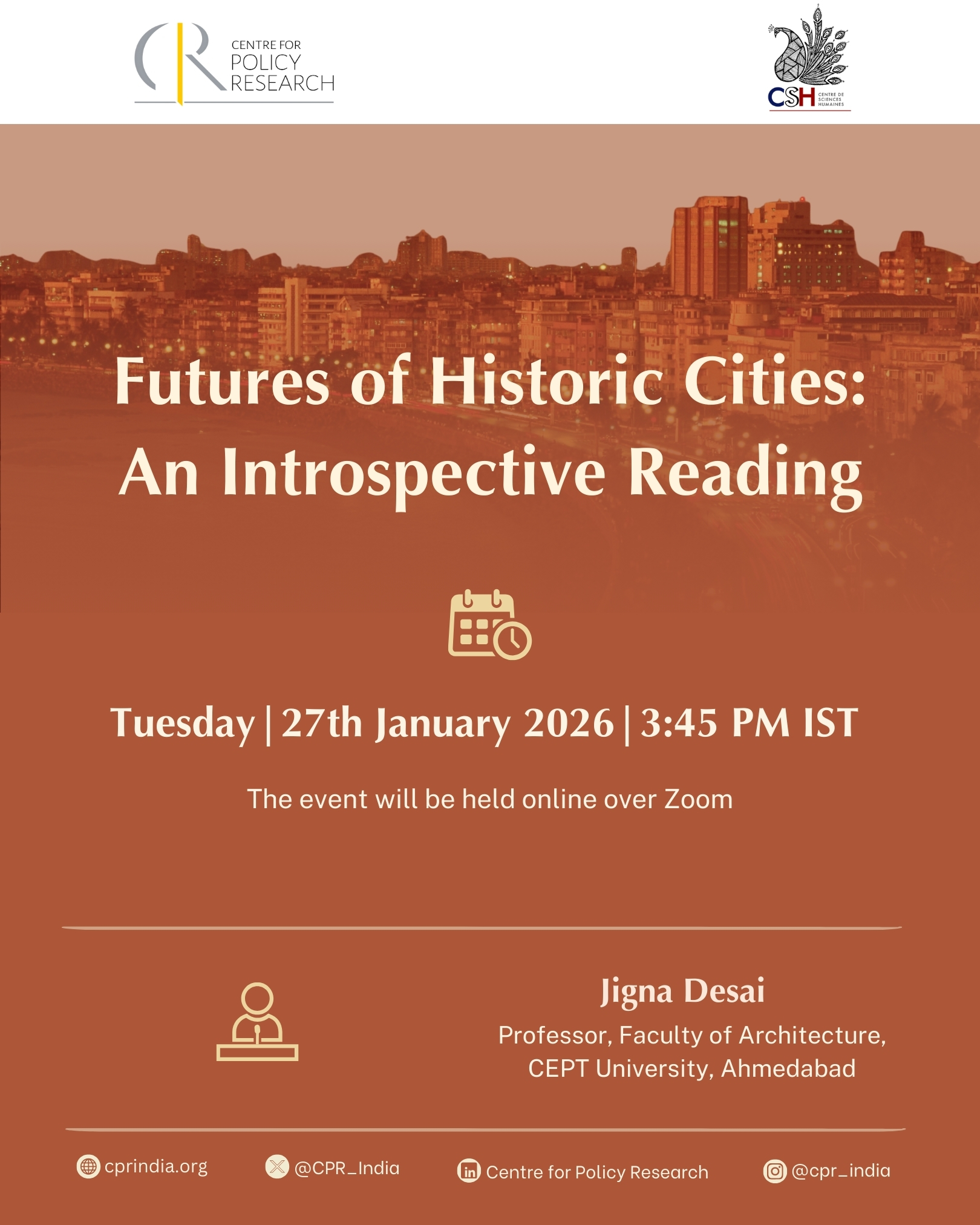 Futures of Historic Cities: An Introspective Reading Jan 27 January 27, 2026 3:45 pm to 5:15 pm ADD TO CALENDAR